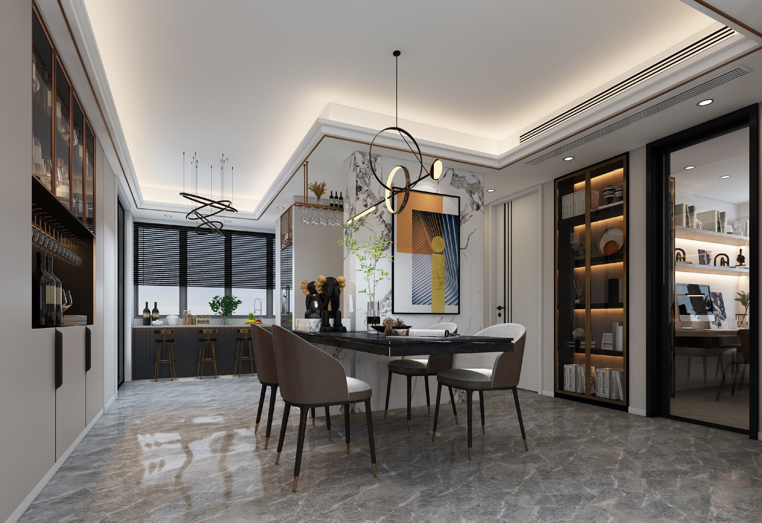 餐厅定制导台餐桌,结合玻璃酒柜