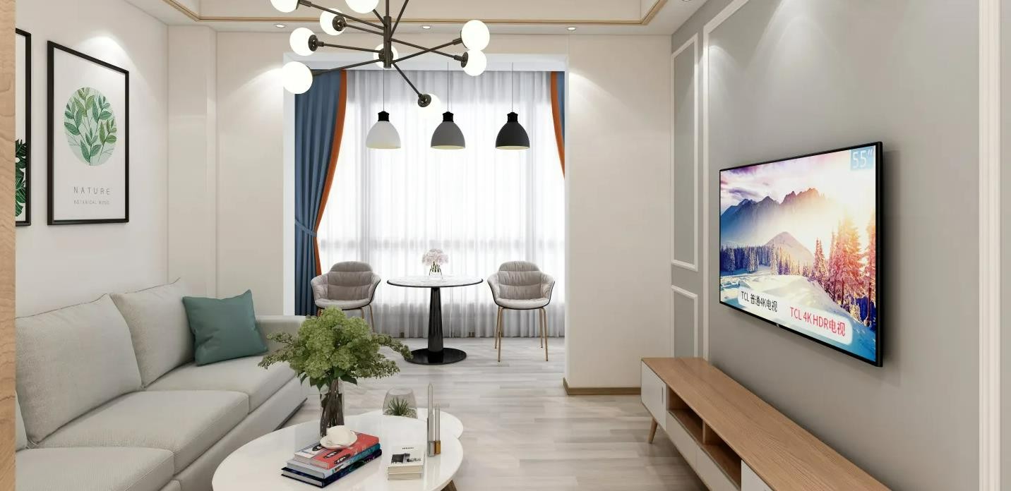 木地板与白色的墙面相辅相成。电视背景墙的灰蓝色,点缀了客厅的色彩。