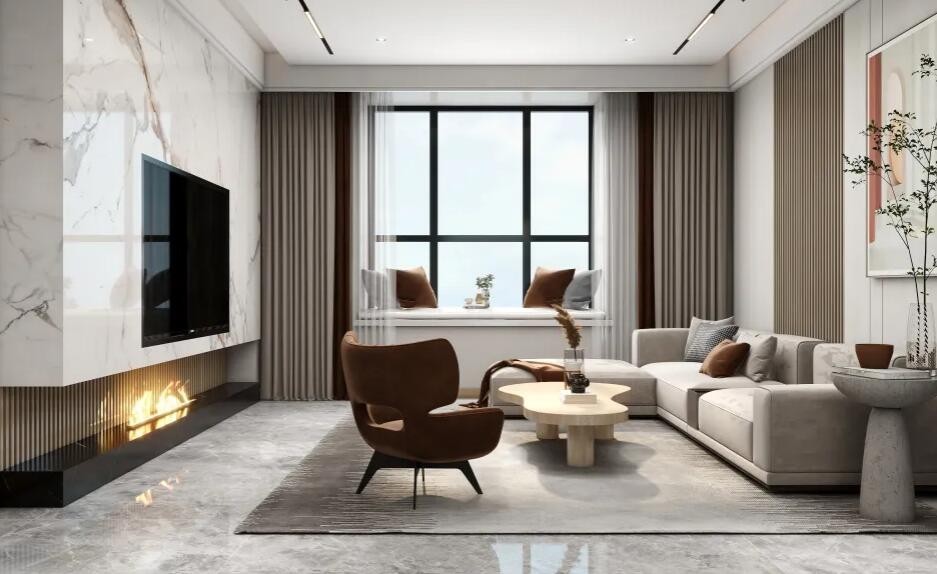 客厅的布局整体简约,开阔明亮。沙发背景墙以壁灯为界,划分出日常休闲与钢琴弹奏两个不同的功能区,组合沙发造型简致,实木茶几素雅自然,搭配棕色单品点缀更显空间层次感。