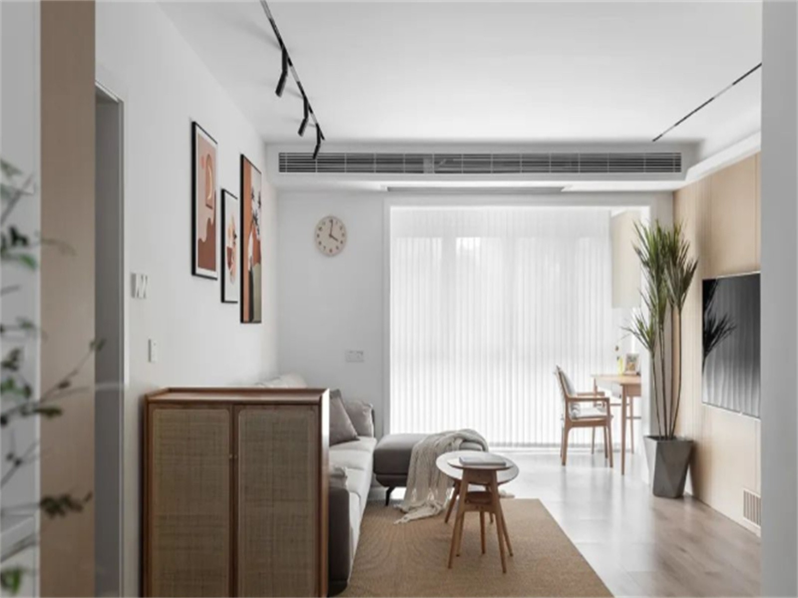 餐厅沿墙做一组餐边柜,白色的柜子与墙面一体,弱化存在感