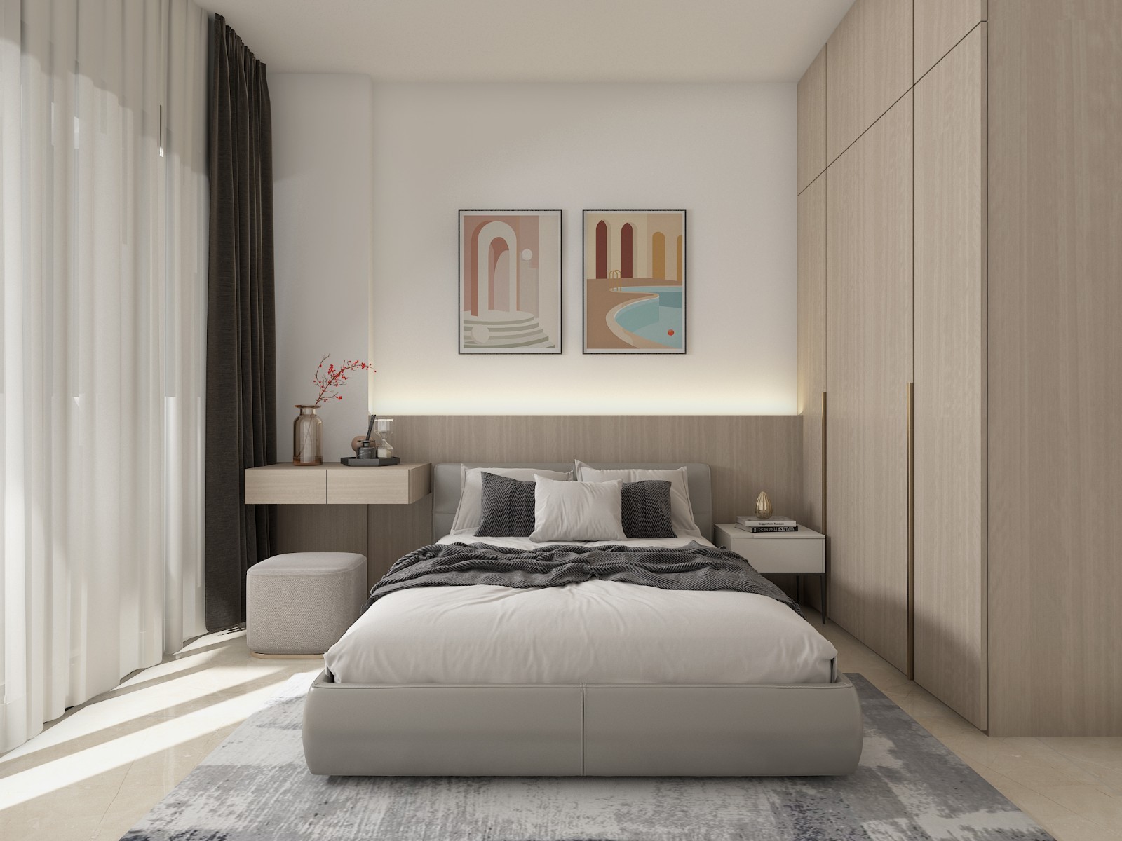 卧室空间在护墙板设计上加入氛围灯,再原木色系的基础上进行搭配,使其跟舒适
