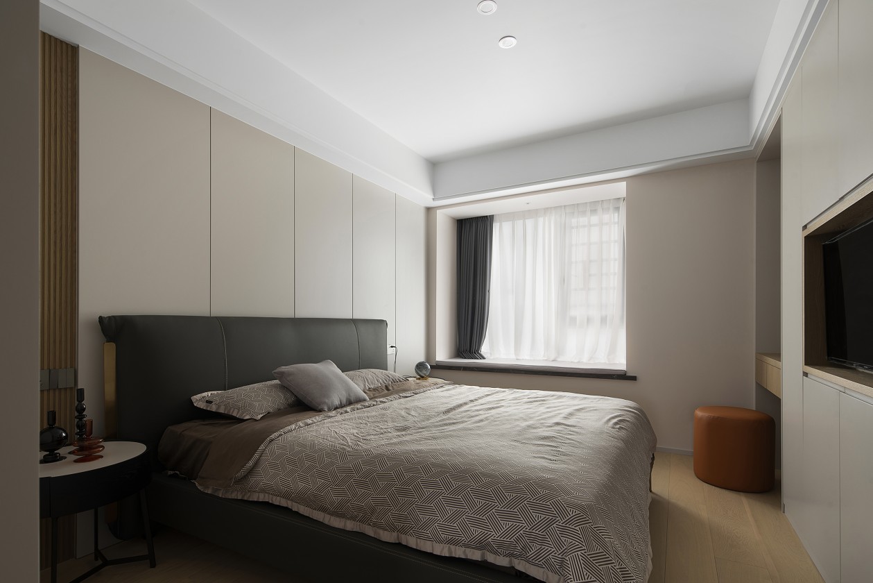 房间风格与客餐厅做到统一,超长衣柜与电视、梳妆台相结合,奶油般的观感,橙色的点缀,纵然四季变换,心中家的感觉一直都在。