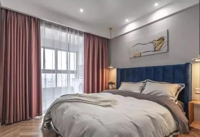 次卧连通了阳台空间,增加整个室内的空间,粉色窗帘与白色纱窗组我诶搭配,打造时尚干净的空灵感,床头是选择了深蓝色,增加沉稳优雅的感觉