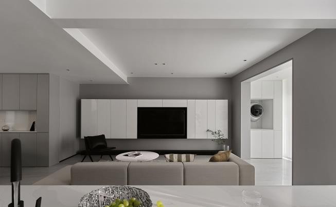 哑光的灰色涂料造就的空间格外安定,悬浮柜则是亮面烤漆白色为主,这种白色能够很好的折射光线,让空间显得更加明亮,无论晴雨,都有好的体验。