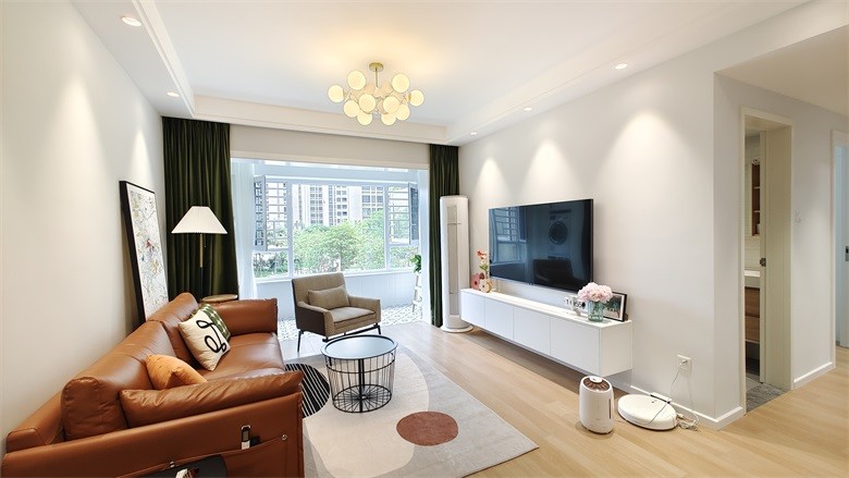 大面积墙面留白、简约悬空电视柜、细脚沙发躺椅、简约小边几......使客厅空间更为轻盈,还给扫地机器人留出足够通道,让卫生无死角。