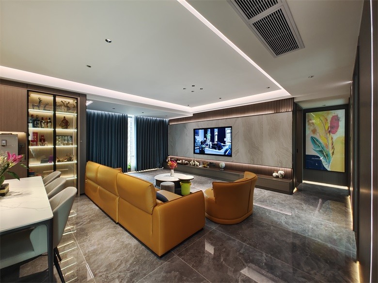 现代风的空间,地面是***灰的质感,顶上是无主灯的设计,居中布置橙色沙发,加入大理石双拼茶几,也显得更时尚***。