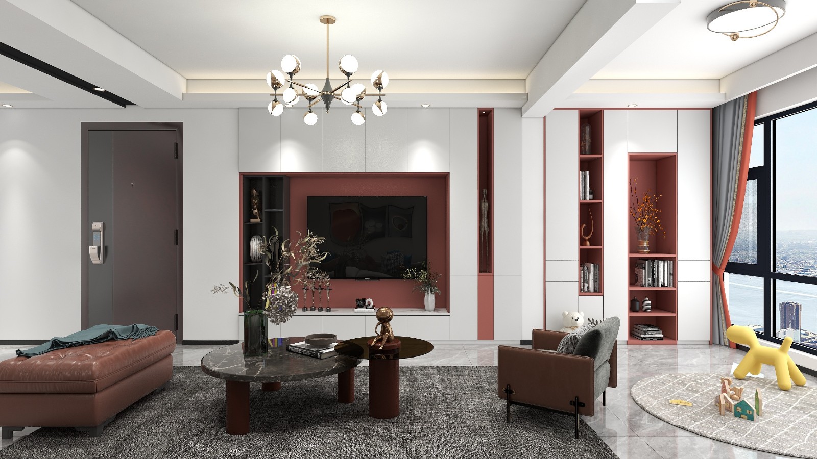 电视柜与阳台储物柜一体化设计,随时储藏儿童玩具