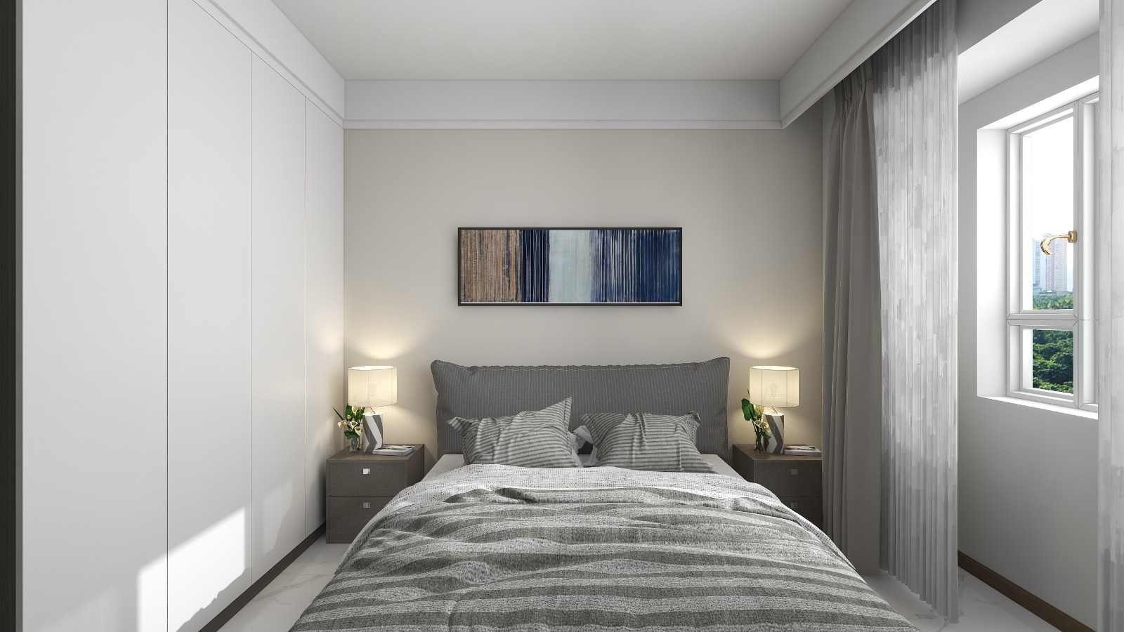 卧室以灰白色为主题色调,配合适当软装,使空间更加温馨。
