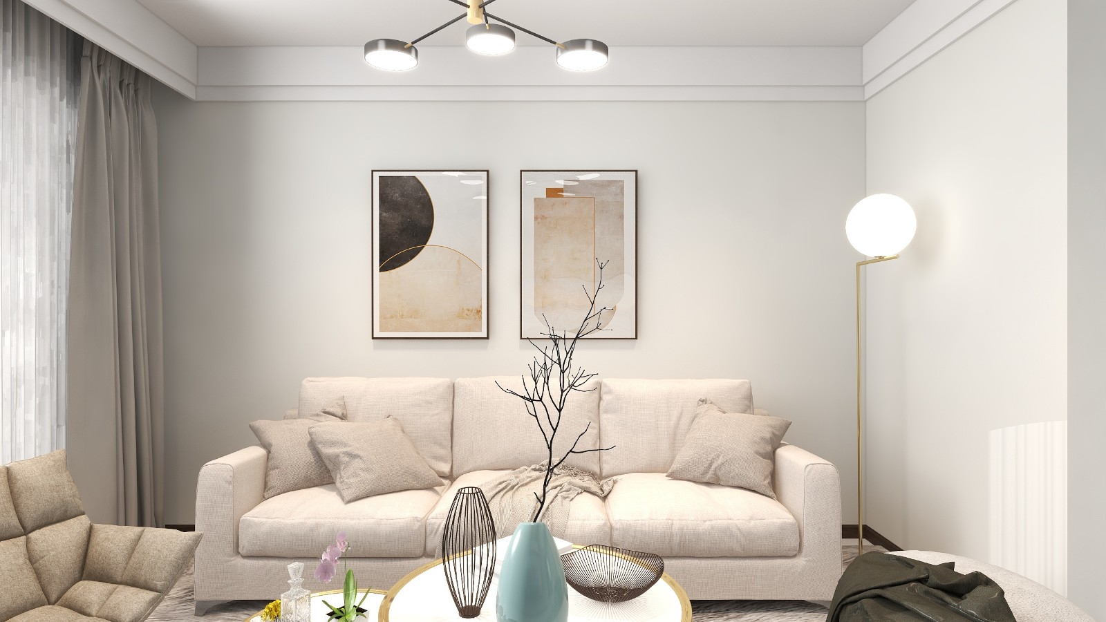 以暖色乳胶漆为底色,搭配白色与亚麻色木质沙发,是整个空间更加温馨。