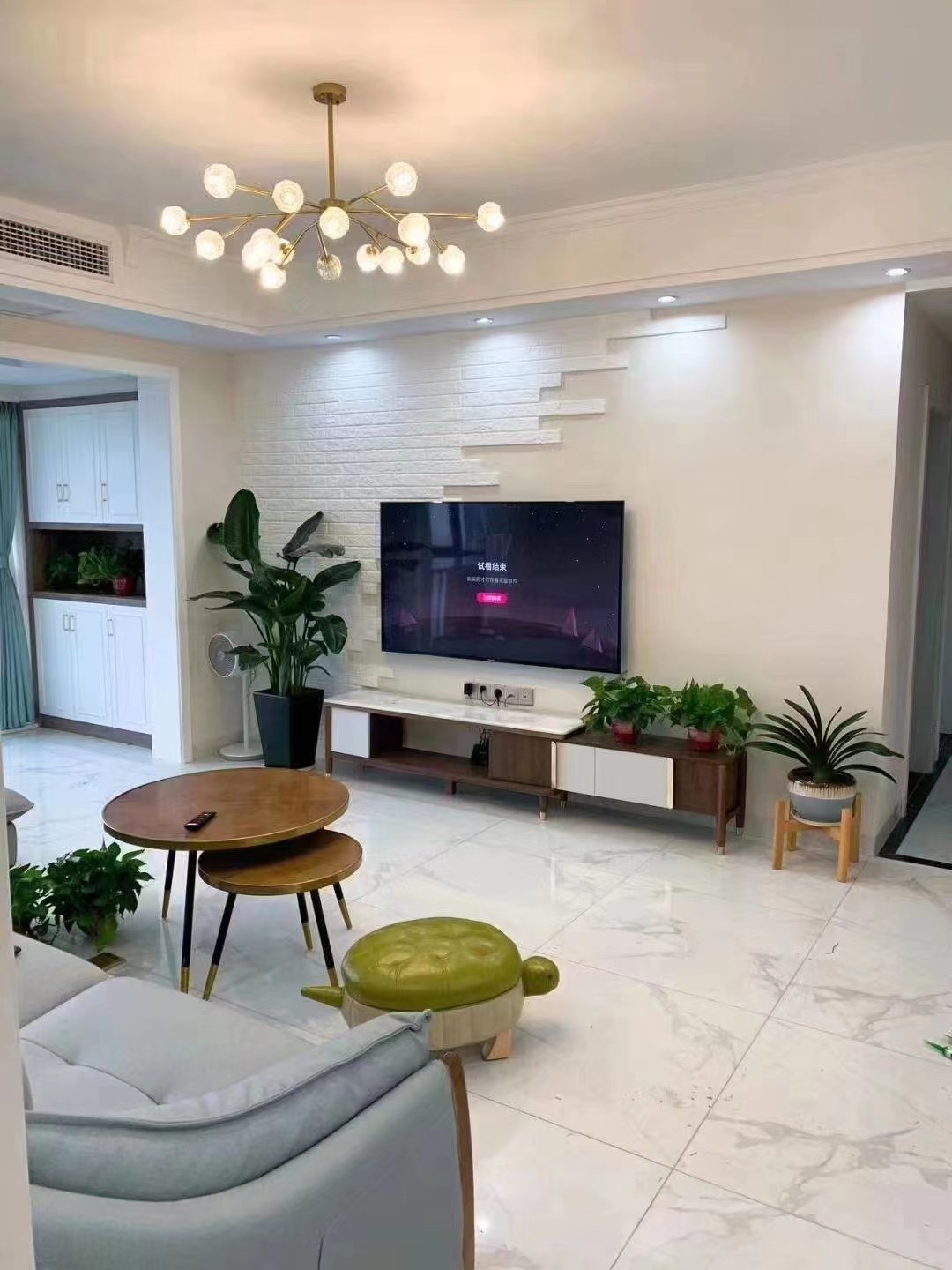 白色电视墙,配上绿植