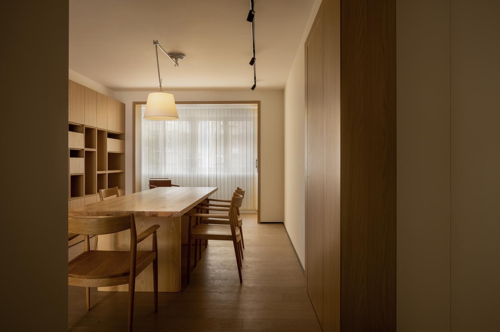 客厅看向厨房,当原来的餐厅被删除时,它被用作厨房的延伸。 整面墙上的高柜设计,不仅扩大了空间的收纳容量,还可以让冰箱、烤箱等设备嵌入其中。 同时,入口处分体式衣柜的设计也避免了大衣柜带来的压迫感。
