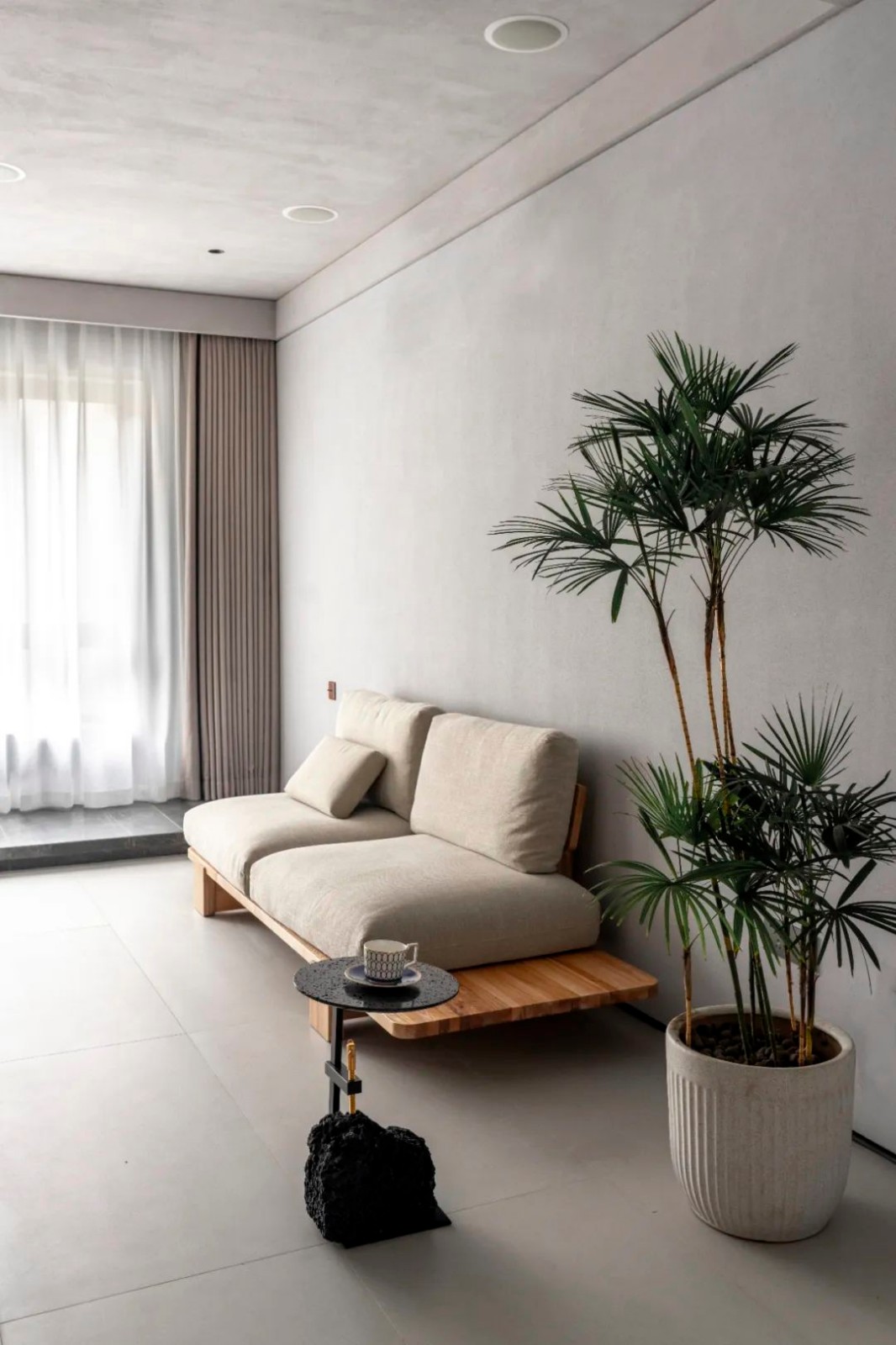 整个客厅采用无主灯设计,筒灯、灯带组合搭配,丰富客厅照明的层次感。地台设计解决了南北空间过长的问题,也为生活增加了更多的闲情趣味。