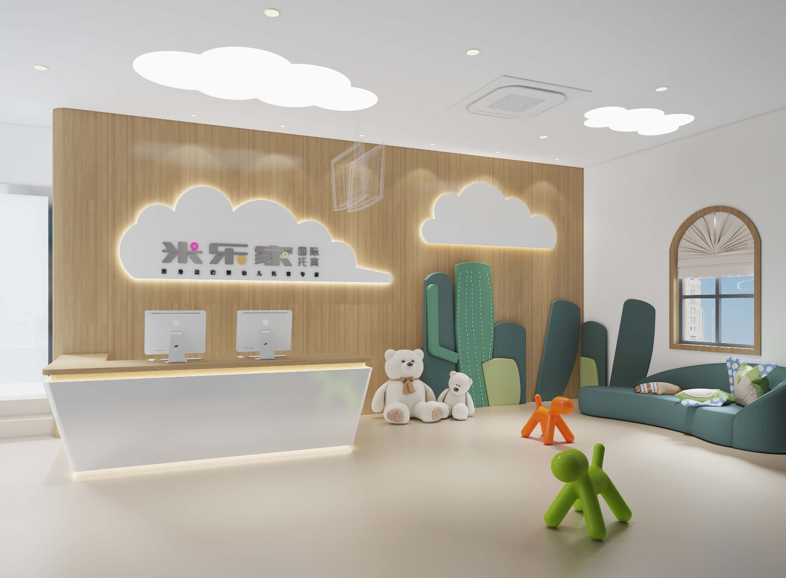 绿色、木色、白色、天花云朵、采用儿童喜欢的元素。