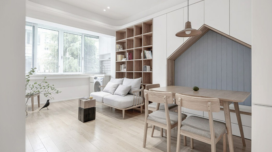 干净的白墙与纯橡木本色的融合,界定出一个慵懒但又充满生命气息的空间,整面的柜体设计用趣味的设计造型表现,从空间几何回归到储物范畴,每一处节点的处理都营造一种细节的***感