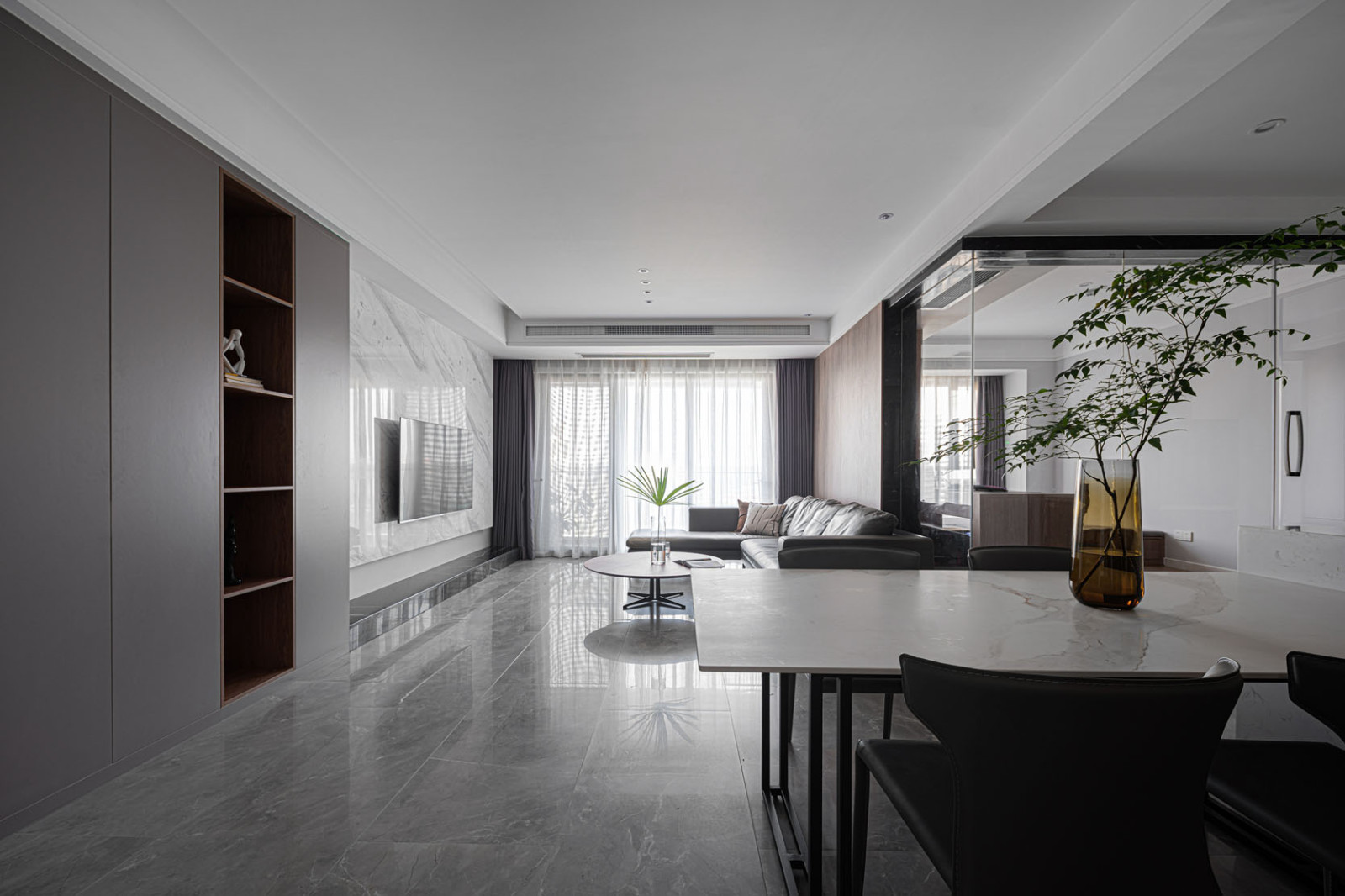 玻璃推拉门后是他们制作美食的中厨区域,白、灰、原木色依然是空间的基调,在充足光线的调和下,呈现出柔和且富有层次的美感。上下整排2.36m+3.49m的大容量橱柜,完全可以使得厨房不会被一丝杂乱打扰气氛。