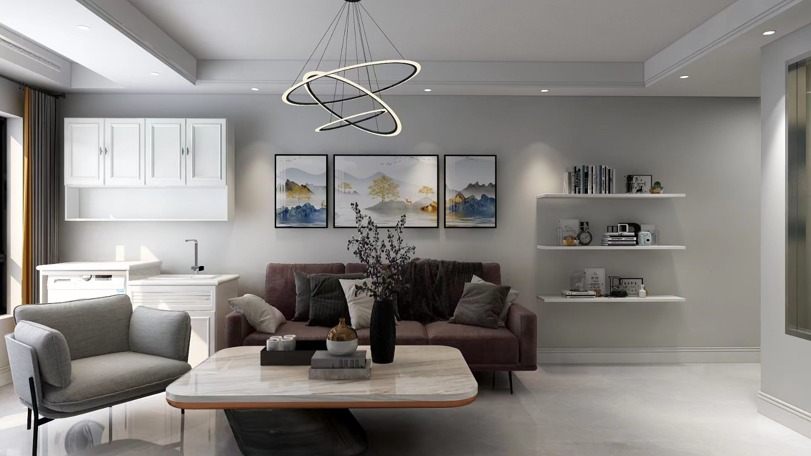 改三居后为了不显空间拥挤,客厅与阳台一体设计,增加通透性,石膏板代替传统铝扣板,使晾衣架嵌入进去,既美观又不影响采光