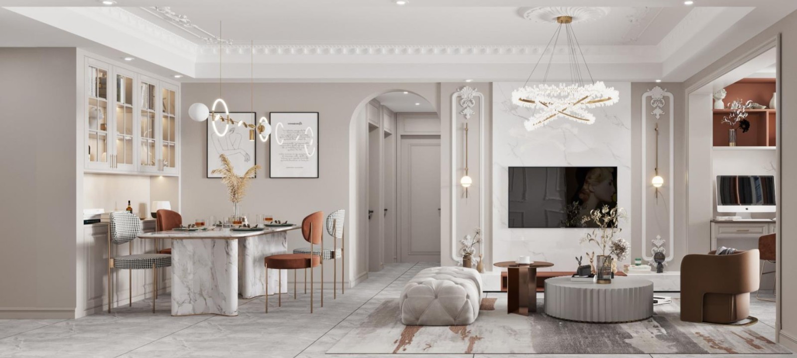 整体采用大量的线条来做装饰,同时电视背景采用定制柜+岩板的造型来丰富空间层次感,过道门洞采用弧形视觉上增加柔美的感觉