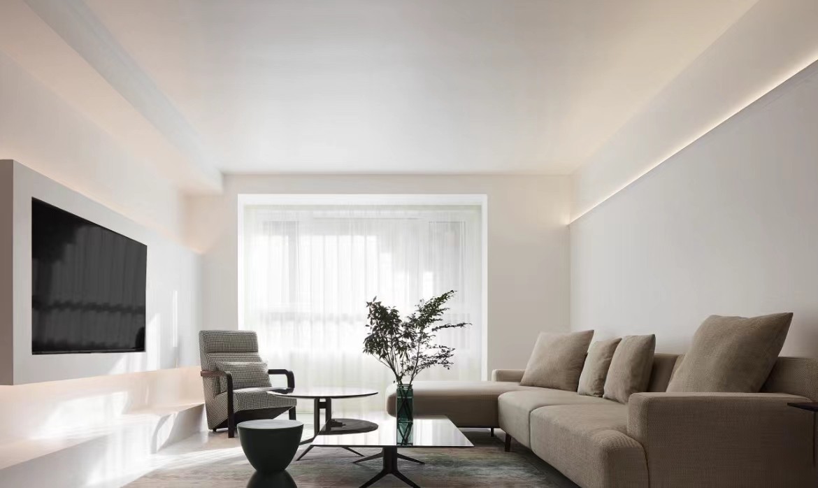 整个空间以白色树脂漆、原木纹为主。原木的质感加墙顶地一体化的白色树脂漆,全屋地面无缝隙、无踢脚线的设计,简单干净安全。为保持屋内设计简洁的质感,全屋采用智能无主灯的设计,在不同功能下的的点光源设计可以为照明带来更多的层次感,让人打开门之后便能感受到家的温度。电视背景墙上下凹进去,以及茶几高低组合使空间更有层次。沙发选择米色更温暖,沙发背后一束墙面洗光打破冰冷的墙面。不多不少,才是刚刚好。