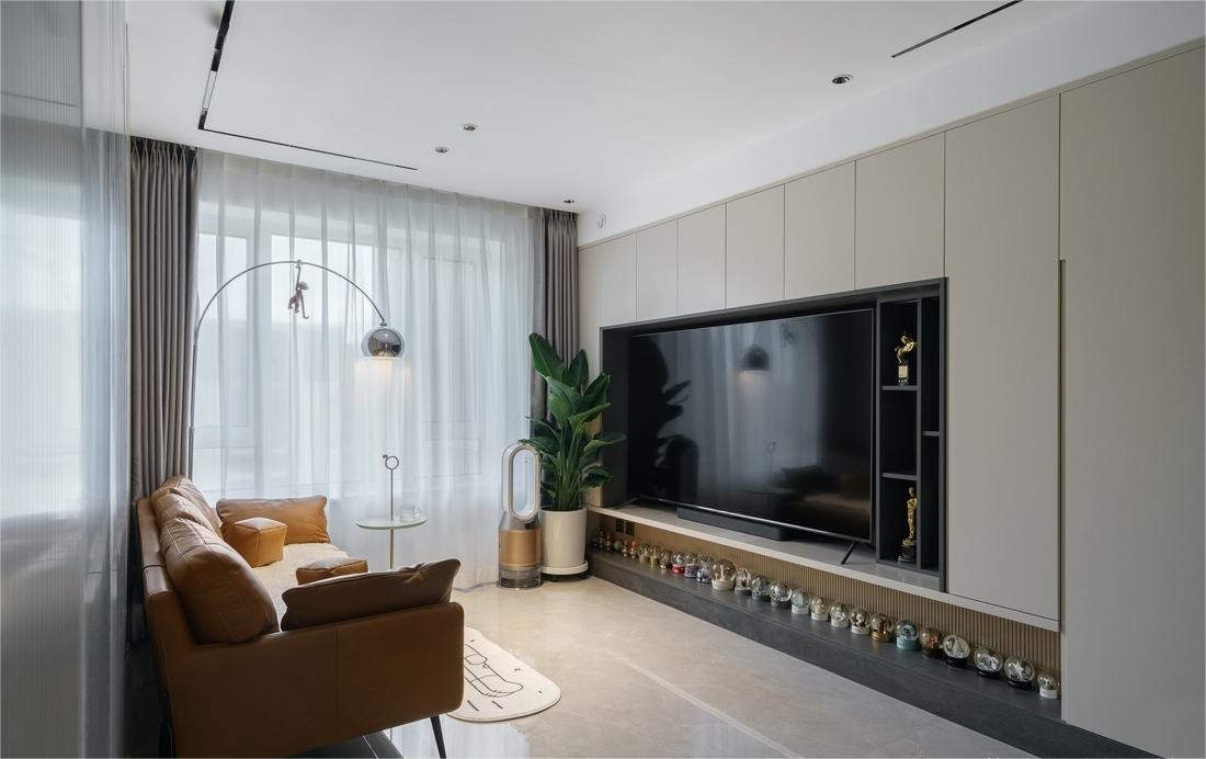 拘于特定的风格,客厅的浅色调柔和自然,皮质的橘调沙发在整个空间中过渡自然,干净素雅之感油然而生。