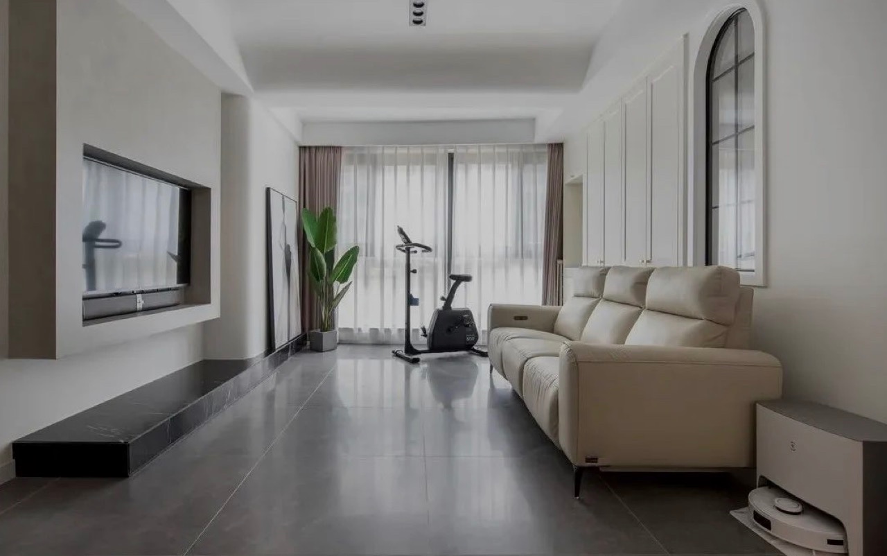 电视机背景墙没有用花里胡哨的设计,大理石地台既能摆放收纳,也可以展示一些绿植点缀空间。沙发背景墙采用隐形式收纳柜+多功能的台盆,方便洗衣服与收纳。沙发背景墙用弧形窗连通客厅与厨房,让客厅整体风格更加生动,也不封闭。