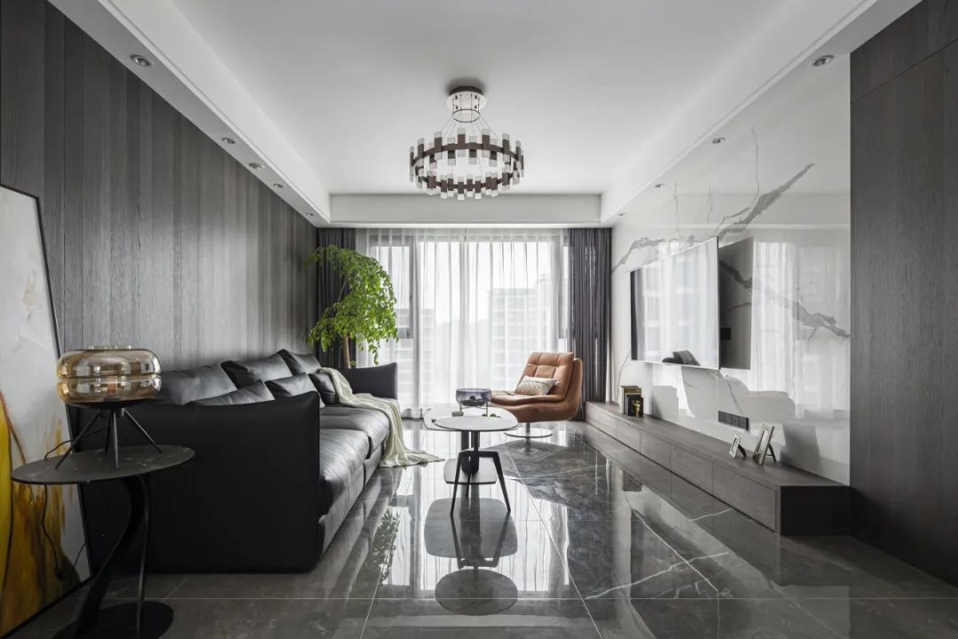 茶几是黑白配的岩板材质搭配,放在这个现代风的客厅里,更是显得时尚端庄而***。