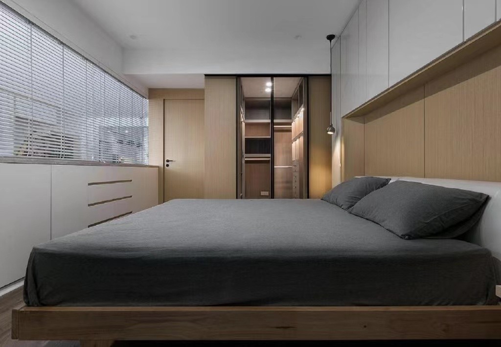 衣帽间和床尾整排半高柜方便衣物和床品的收 纳。
