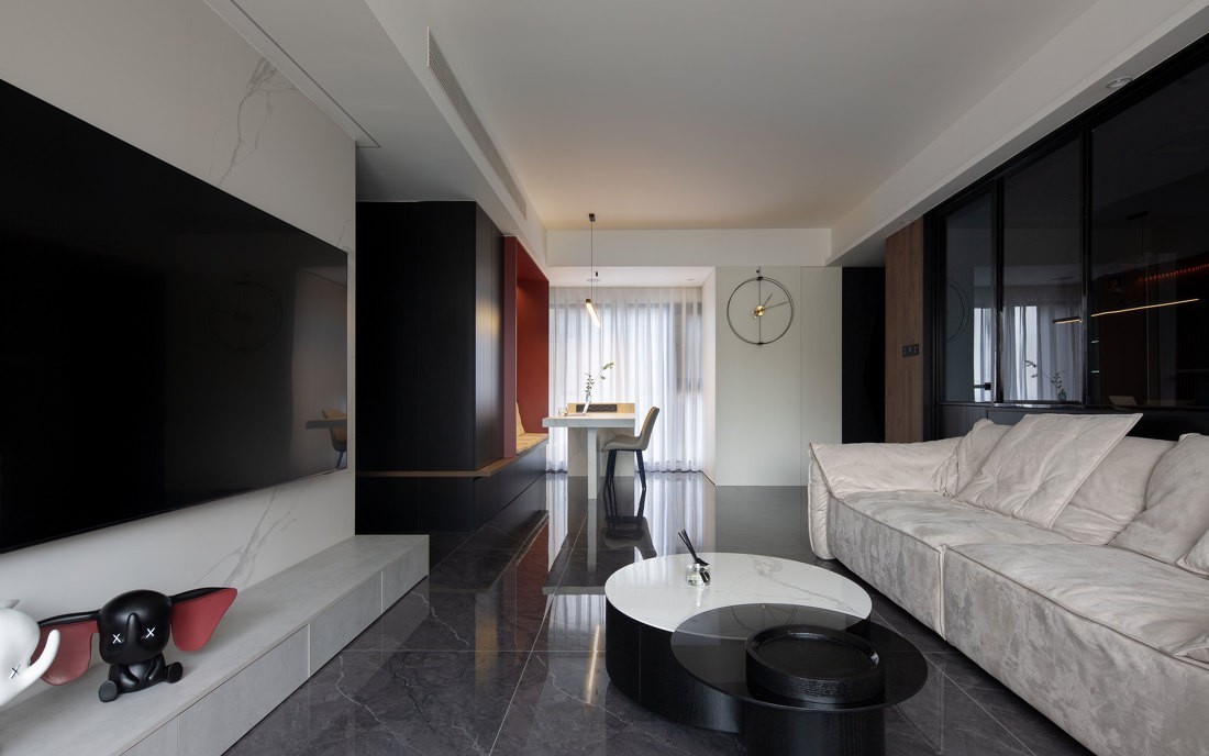 卫生间墙面选用的是两种材质做空间对比,黑色的黑白根大板瓷砖墙面和白色的爵士白墙面形成一种对比呼应的空间关系。