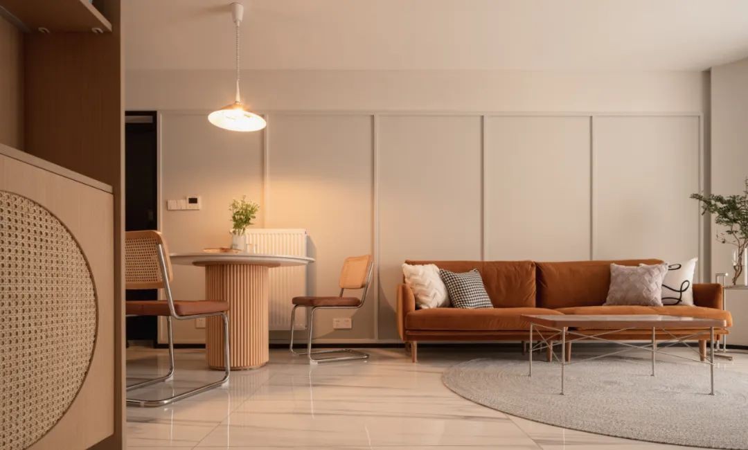 平时就一个人住,晚上经常需要加班,做饭的几率很小,父母偶尔过来烟火气会重一些,所以选择了一个三人位的小圆桌放在靠墙的位置。