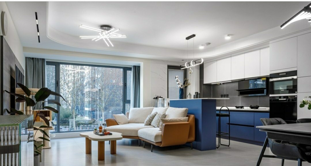 客餐厅均铺设灰色地砖,未进行刻意区分,依靠材质、灯光,形成自然的过渡。客厅顶面力求简洁的同时,也融合吸顶灯、磁吸灯等多种光源,营造出多层次、有重点的照明氛围,拒绝阴暗死角。