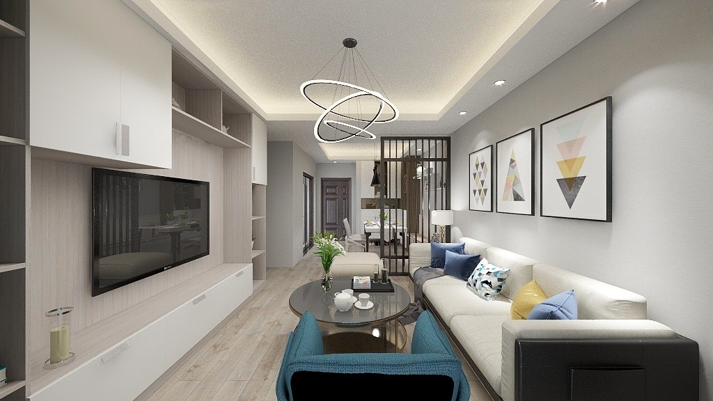 客厅电视墙装了一排的储物柜,整体开放的展示架,摆上书籍与装饰品,地柜上方是一排留空的隔层,可以放些工艺品来增加客厅内的点缀