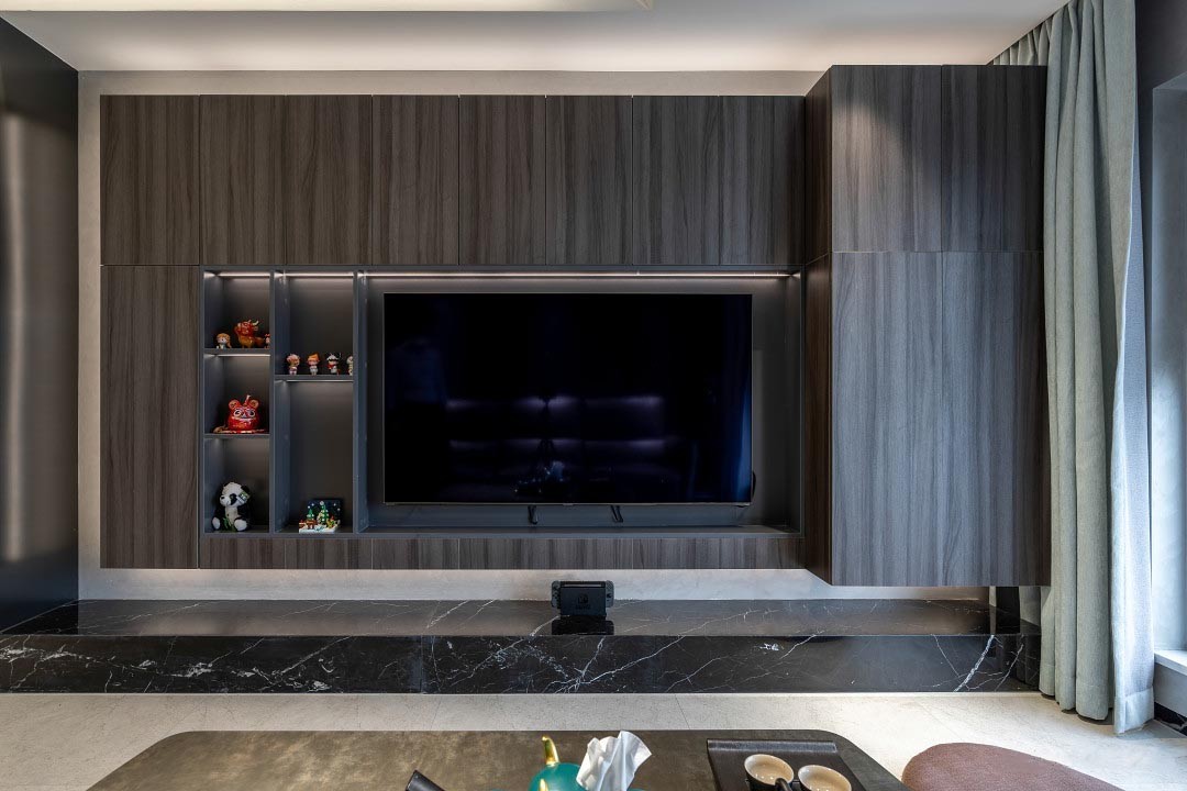 木饰面板本身的纹路可以很好地隐藏柜体的缝隙。中间利用黑色不锈钢作为展示格间,摆上可爱摆件,画面立刻活跃起来。