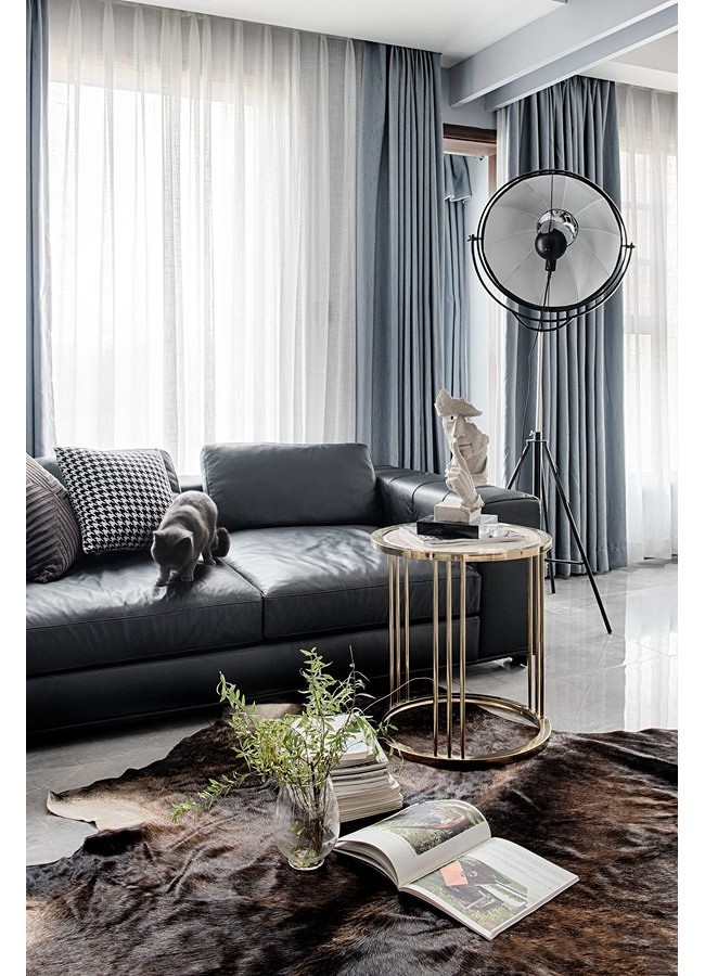 用深棕色沙发搭配冷色系大理石瓷砖更显空间质感。