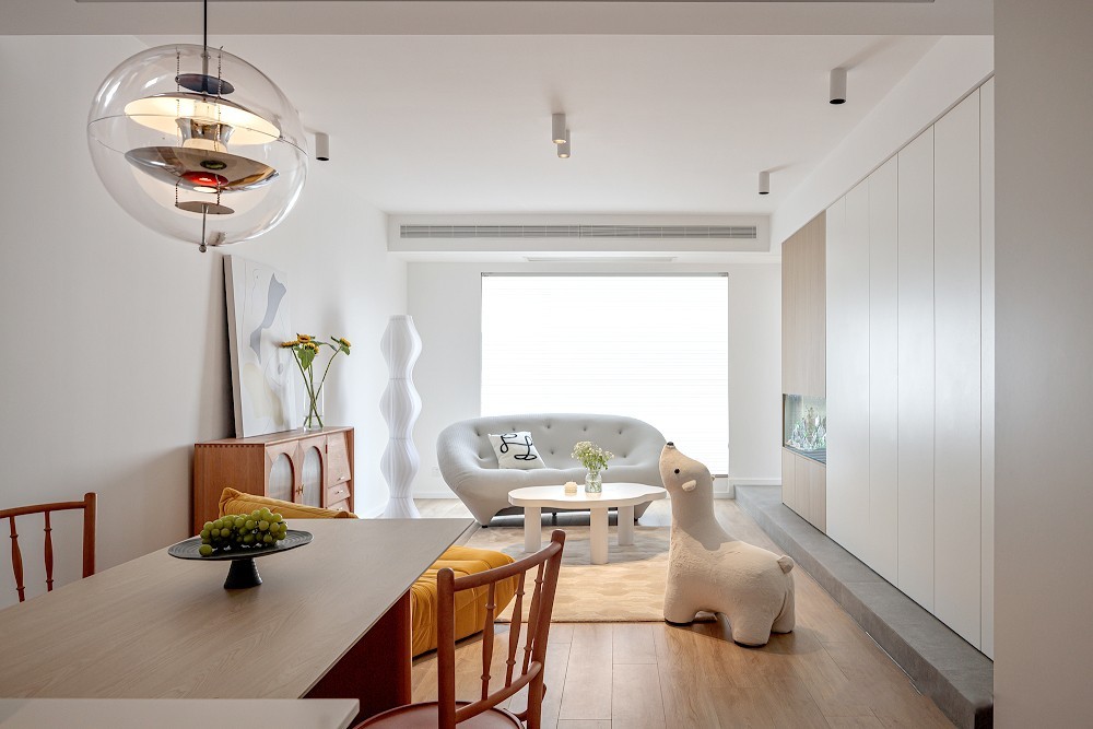 低保和的橙褚、白鹭、冰川灰提升空间彩感,而造型的多趣化丰富空间层次,诱发出屋主对空间的多重感知。 除一整面收纳柜满足日常生活所需,强化功能外,其余均摒弃繁杂元素。弱化具象风格,选择极简、自由灵活的陈设方式,以开阔的视觉、舒适的尺度打造轻松明快、可变化的室内氛围,为未来会多一位孩子的打算预留了充裕的空间。