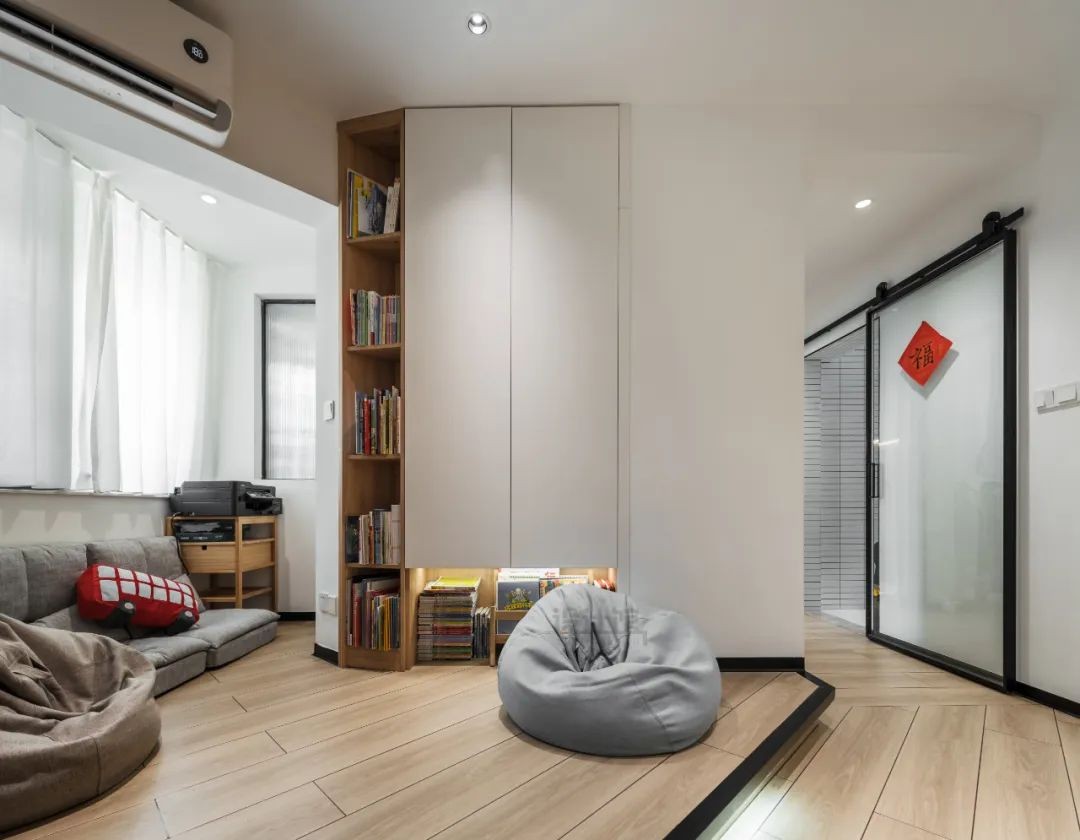 原户型是两房,改造后做成了三房的格局,尽管面积不大,却也是“麻雀虽小五脏俱全”,为四口之家提供了一个舒适轻松的居住空间,并且见缝插针式地在空间各个角落植入了收纳设计,真是做到了不浪费每一个平米。