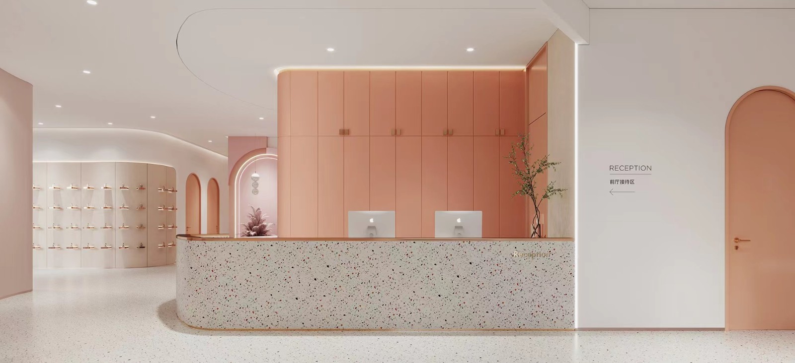 前台做了弧形处理,背景墙利用粉红色回首清楚的记忆。