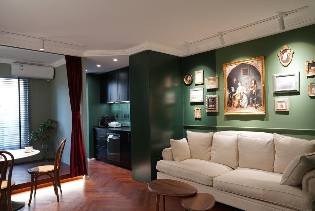 通过吊顶划分出了区域,厨房黑色的橱柜在整个客厅里,给大面积的绿色带来了“解腻”,显得更有质感,不同色度的绿色串起了整个空间的过渡,沙发和橱柜之间以前是用墙体包起来的管道井,现在我们采用柜子包管道,***化的利用空间。