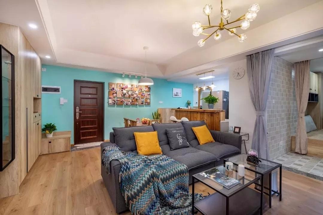 客厅以原木色为主色调,墙面刷Tiffiny蓝,让整个空间活力十足。