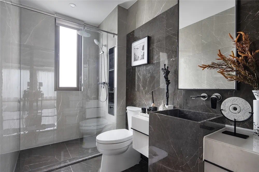 卫生间区域是家居生活用水最多的地方,即使设计了干湿分离,也大量采用了瓷砖和石材。深灰色、浅灰色、白色的大面应用,让卫生间明快,整洁。