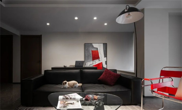 黑色皮质主沙发搭配钓鱼灯,红色单椅与挂画相呼应,丰富空间色彩层次