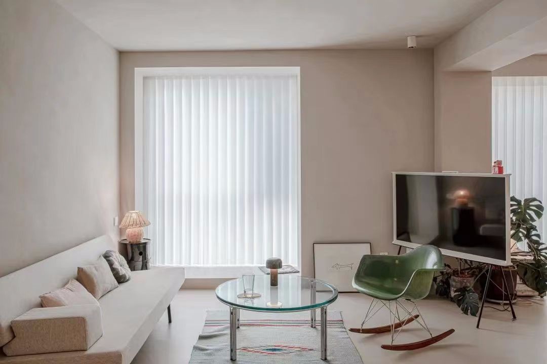 客厅落地窗采用了梦幻帘,既有布帘的通透性,又有纱帘的通透感,还兼具百叶帘的调光性。取缔了传统窗帘只能敞开和闭合的单一方式,在个人隐私保护上也更加人性化。