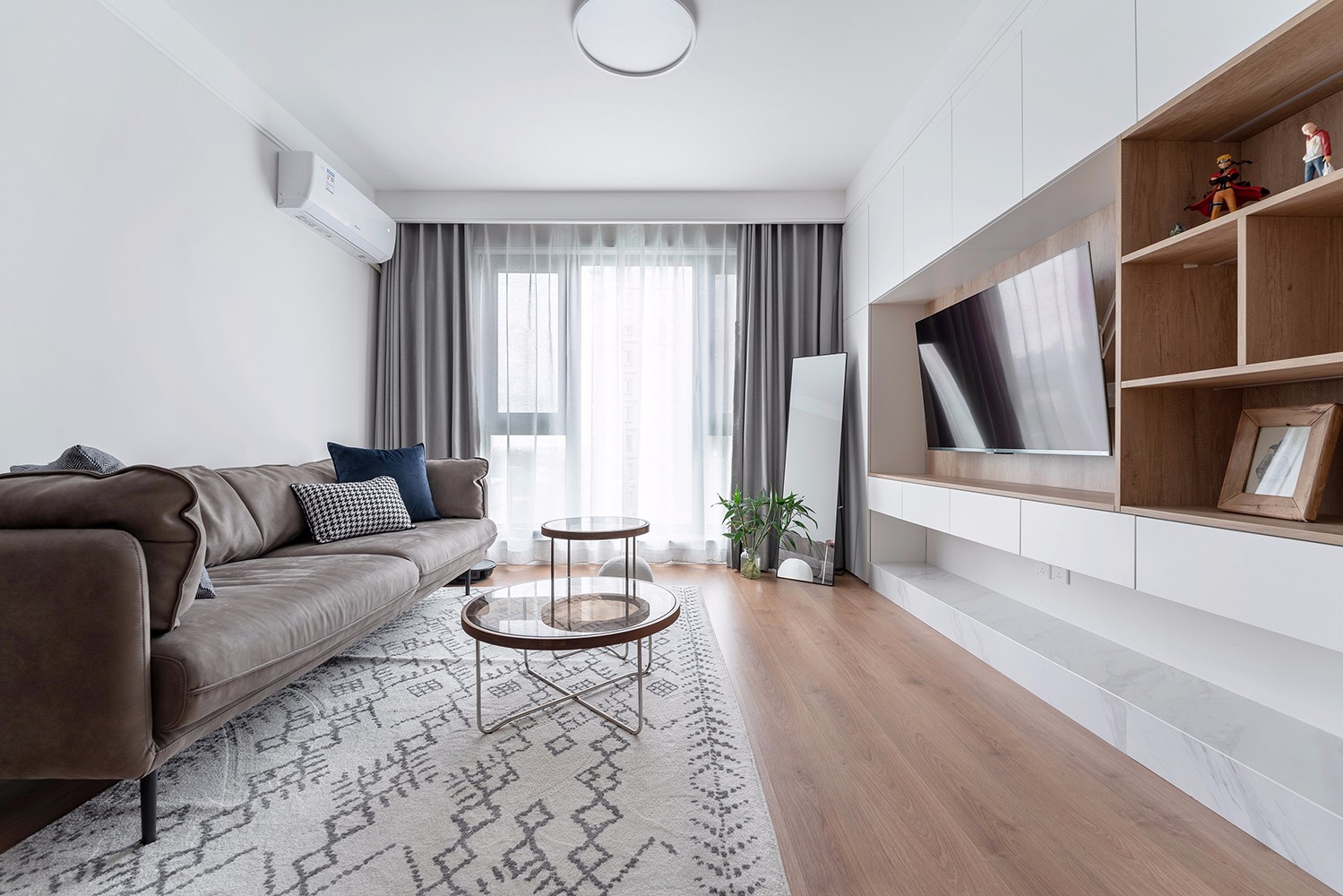 客厅空间木色和白色的温柔搭配,温和的色彩能瞬间将刚回家的女主人拉回到放松的状态,木地板和木饰面的呼应,将空间悠闲惬意的氛围拉满。