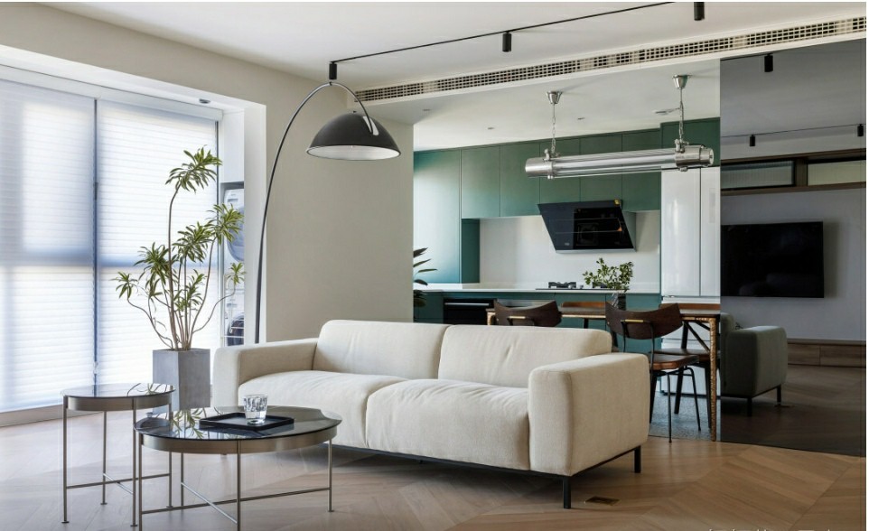把和厨房的隔墙打通之后,客厅的采光变得更好,整个空间更加通透和敞亮,动线也缩短,家里来了客人之后会十分方便,完全能同时容纳6-8人。 自带超大落地窗,很适合打造成一个能充分放松的地方。