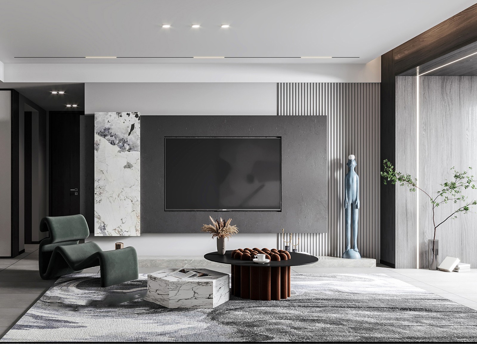客厅的沙发背景墙并没有设计过多复杂的设计,只是放了装饰画作为装饰,电视背景墙用的岩板作为装饰,使整个空间有层次感,给人感觉十分舒适。