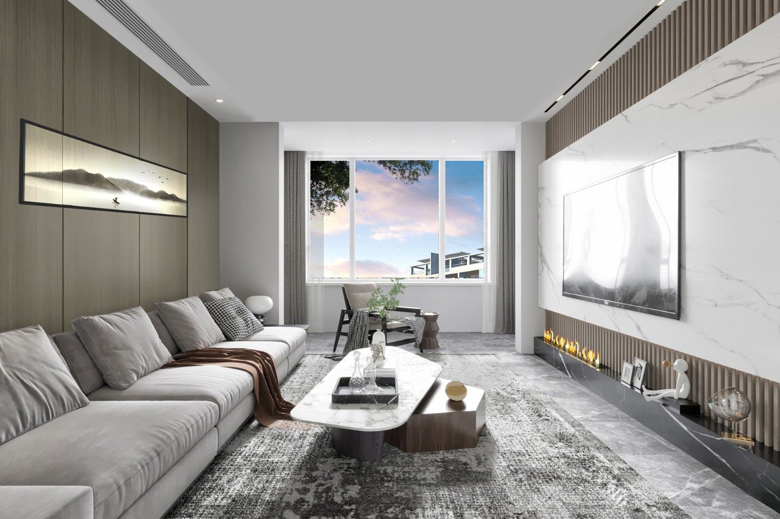客厅简洁大方,并没有什么多余的家居,功能齐全,沙发、岩板电视墙,让不管从哪个角度观看的感觉都非常舒适。