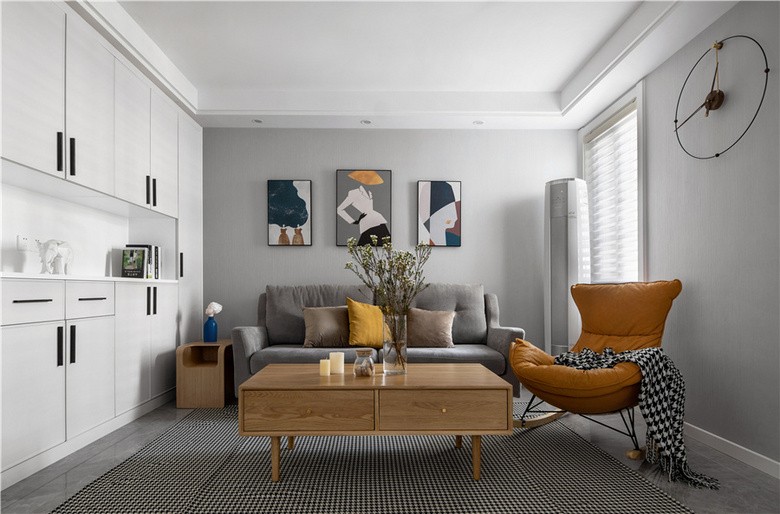 客厅边上做一排储物柜,不仅合理利用了空间更填补了空白之处,软软的一字型沙发真是想让人忍不住想在上面瘫睡。