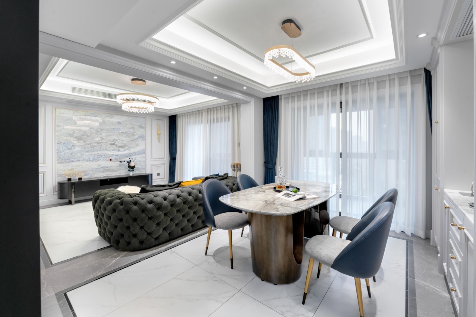 客厅与餐厅形成背靠背布局,大面的落地玻璃窗,光线充足,白色窗纱在蓝灰色系的空间主题映衬下,更显温柔慵懒。