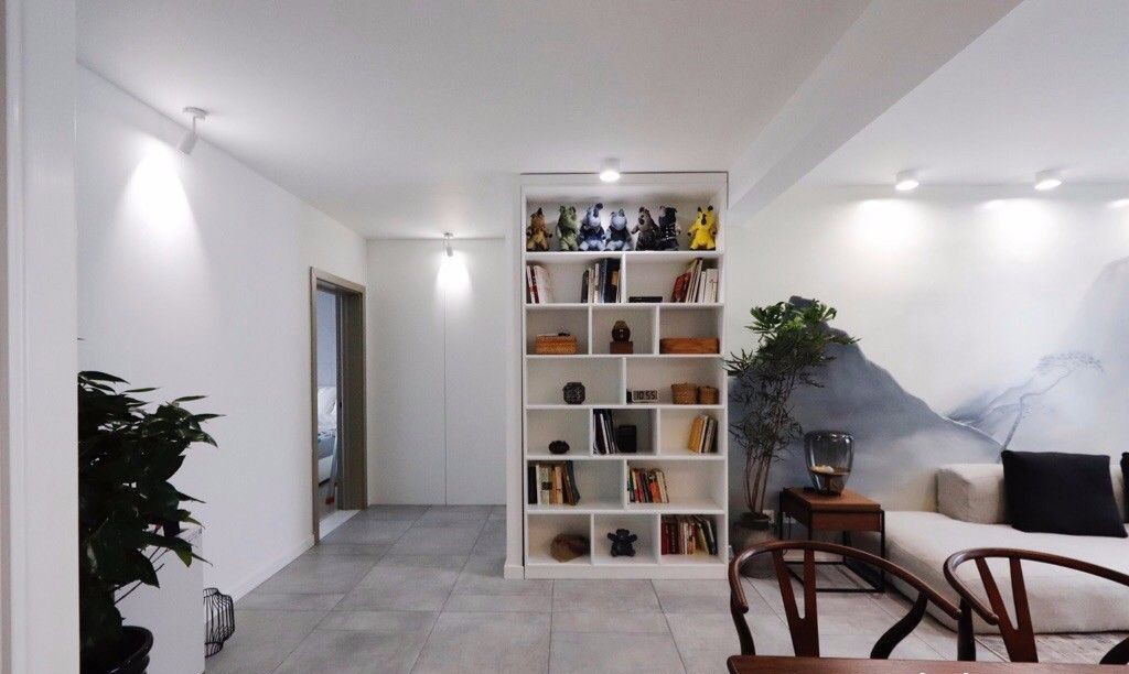 墙体改动后,嵌入书柜视觉上遮挡了卫生间和卧室,把卫生间门做成隐形门,再次减弱卫生间的存在感;
