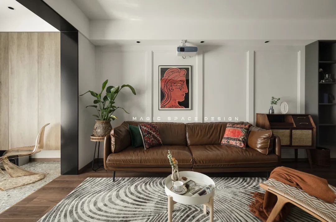 客厅电视墙是鲜绿色的乳胶漆,边上布置一个编织花篮的绿植,使得空间更加有生机活力气息。取消电视机以投影幕布设计,为主人提供了更加时尚前卫的客厅体验。
