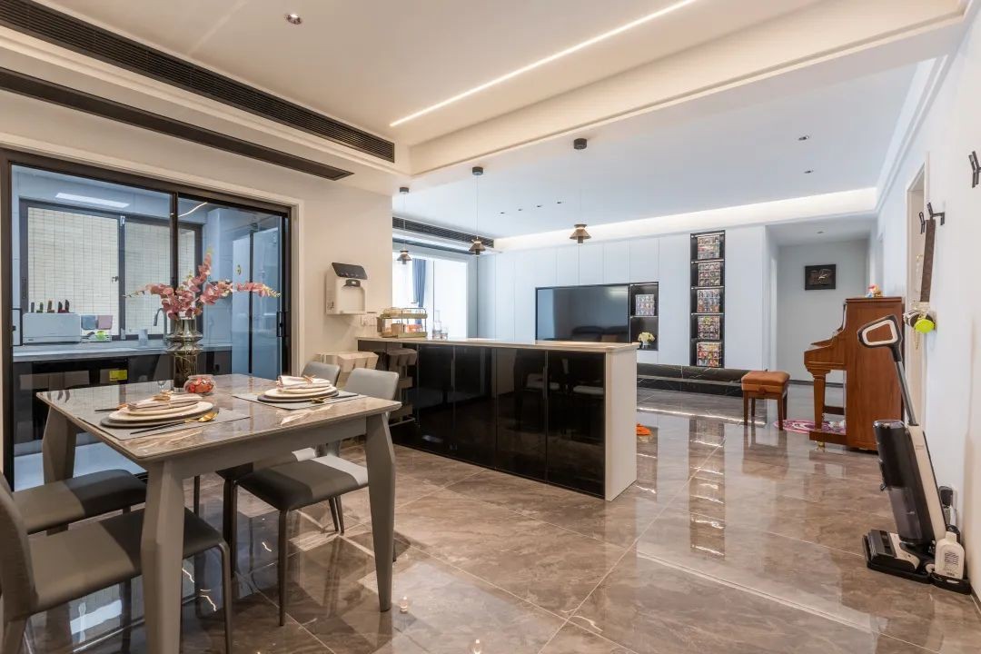 开放式餐厅是品质生活的升级,富有大理石纹路的餐面上,没有过多繁杂的布置,绿意植栽的点缀,为空间注入欣欣向荣的生命力。