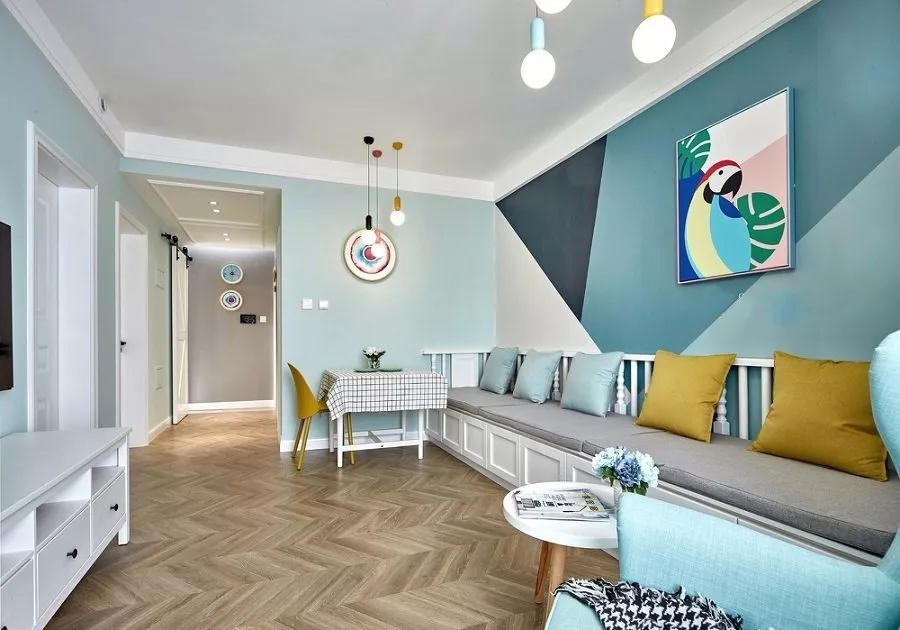 一个很出彩的小户型设计案例,首先色彩搭配得很舒服,不同深浅的蓝搭配使用,自然纯净,点缀以明亮的黄色,宁静的小家变变得活泼起来了。